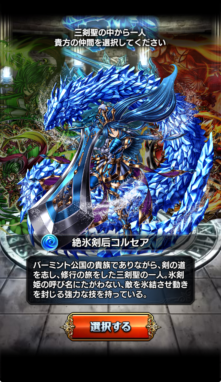 三剣聖「炎剣士クライド」、「氷券姫コルセア」、「双騎士アルス」から選びます。