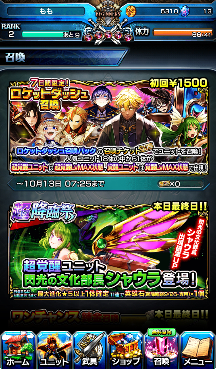 オススメは「ロケットダッシュ召喚パック」で人気ユニット10体の中から1つ高レベルで覚醒した状態で召喚されるので絶対に獲得しましょう!