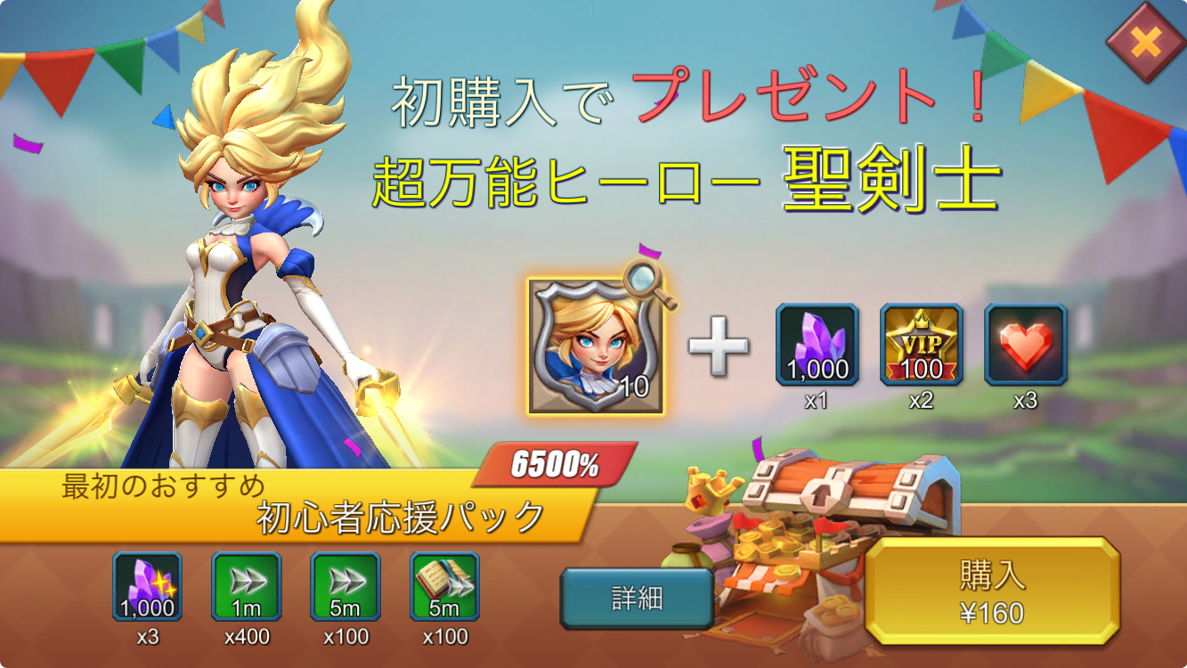 課金要素としては、初回購入160円で超万能ヒーローの薔薇の騎士と便利アイテムを獲得できます。