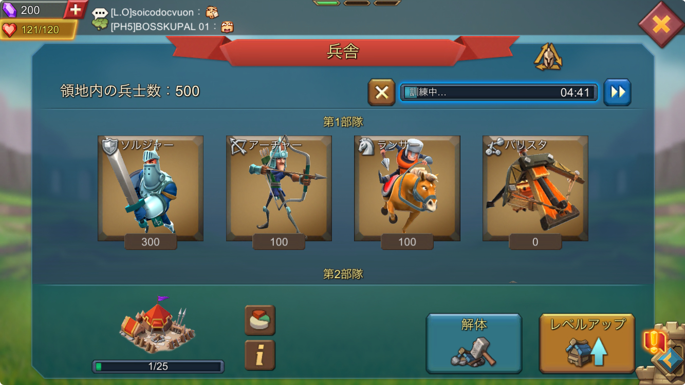 キャラクターのレベルによって統率できる兵士の数が違うため、拠点を拡大したり、バトルにおいてもキャラクターの育成はとても重要になっていきます!