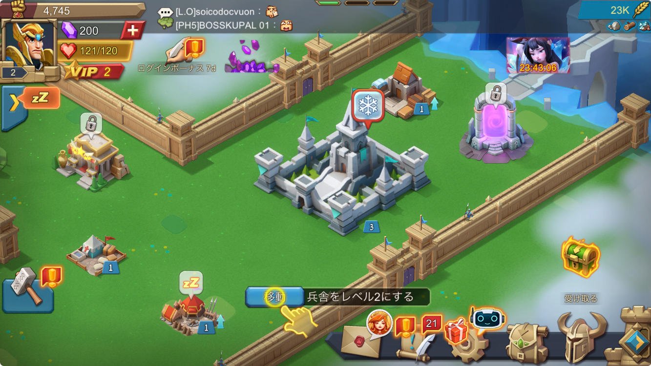 移動のボタンをタップしているだけで自動で移動してくれて、建築物のレベルアップや軍の訓練などを進められます。
