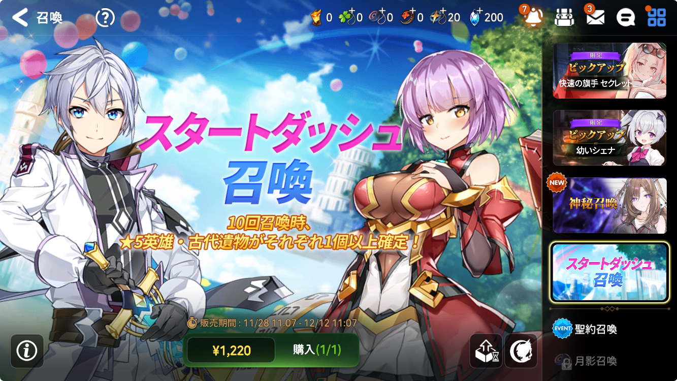 課金要素としては、☆5英雄と古代遺物が確定でもらえるスタートダッシュ召喚がオススメです!
