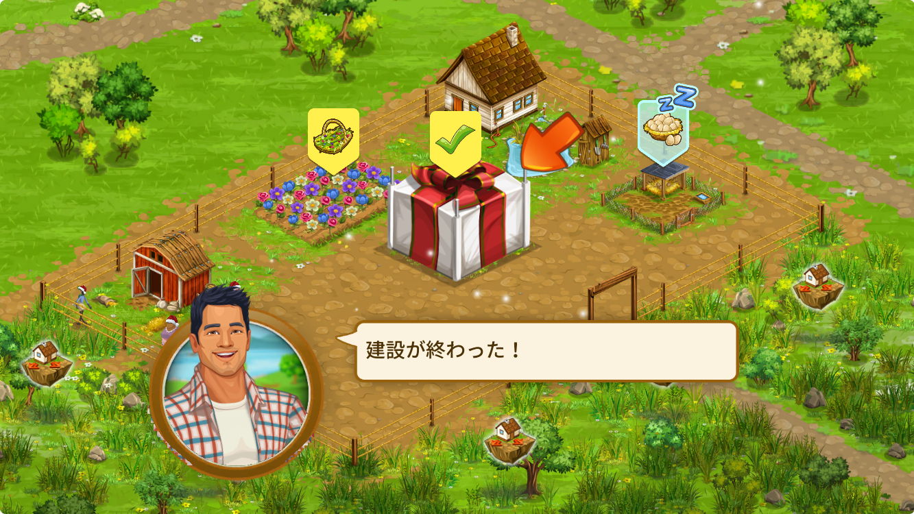 例えば、建設が必要な場合は何をどこに建設するかを選択します。時間が経過して建設が終わるとプレゼントボックスが現れるため、こちらをタップするとクエストクリアとなります。