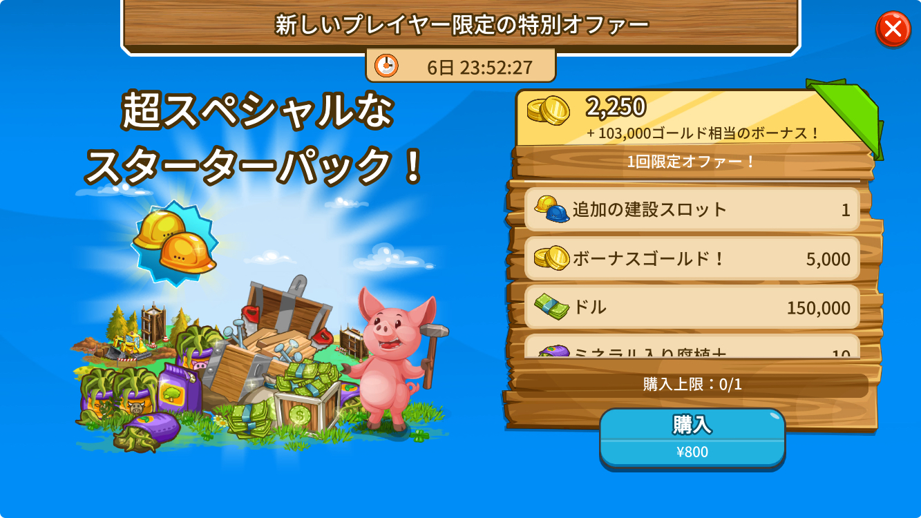 ゲームを始めて1回しか買えない初心者限定の一週間限定スターターパックなどもあり、効率的でスムーズに農場を拡大したり、いいアイテムが欲しい人は課金してみることをおすすめします!
