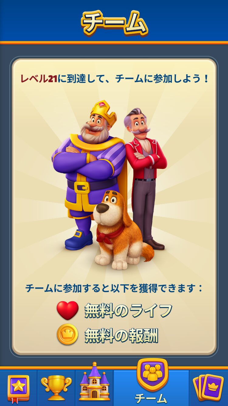 ステージ21までクリアするとチーム機能が開放され、他のプレイヤーとチャットでコミュニケーションが取れたり、チームに参加してライフやアイテムを分け合ったり、一緒に協力しながら報酬をゲットすることができます。