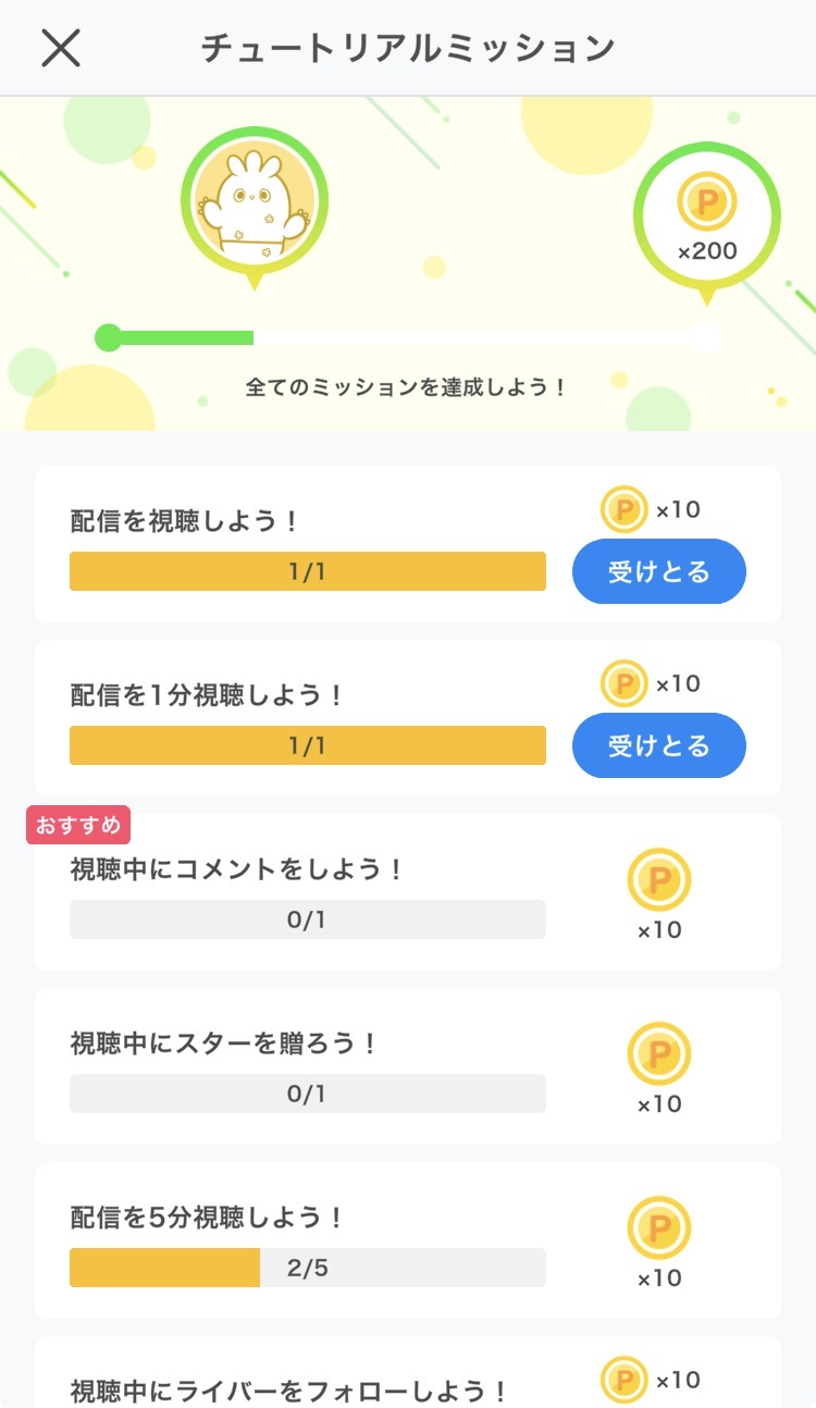 アプリの使い方や視聴者として楽しく配信に参加する方法を覚えるチュートリアルミッションになっています。
